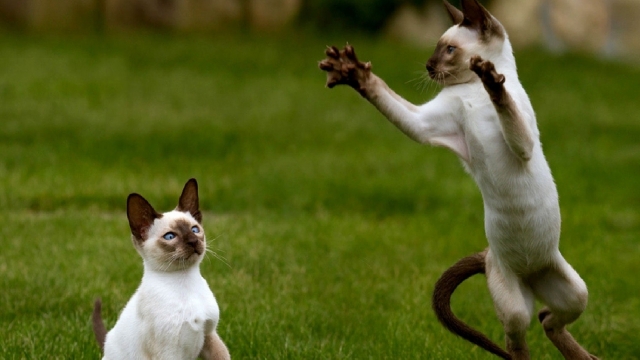 Wij oefenen voor het poezen W.K. ... Als doelman ben ik de beste : ik grijp alle ballen zodat ze niet kunnen scoren . Waarom kijkt de aanvaller zo sip ? Is het hem weer niet gelukt omdat ik " the champion " ben ?