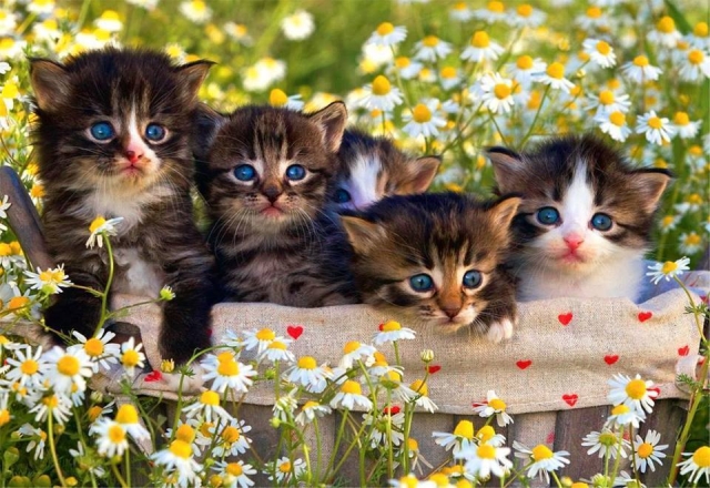 Met vurige , blauwe oogjes kijken zij ons aan . Tussen de vergeet-me nietjes zijn ze op hun plaats . Wie wil hen adopteren ?
