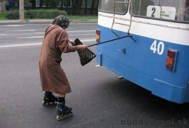 Niet gemakkelijk een bus vooruit duwen op rolschaatsen.