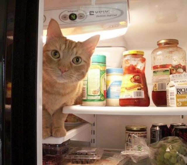 Op zoek in de koelruimte naar een lekker hapje ... Tevergeefs ! Weten ze dat ik er af en toe een kijkje kom nemen ? Ik zal ze beter in de gaten moeten houden en mijn neus achterna gaan !
