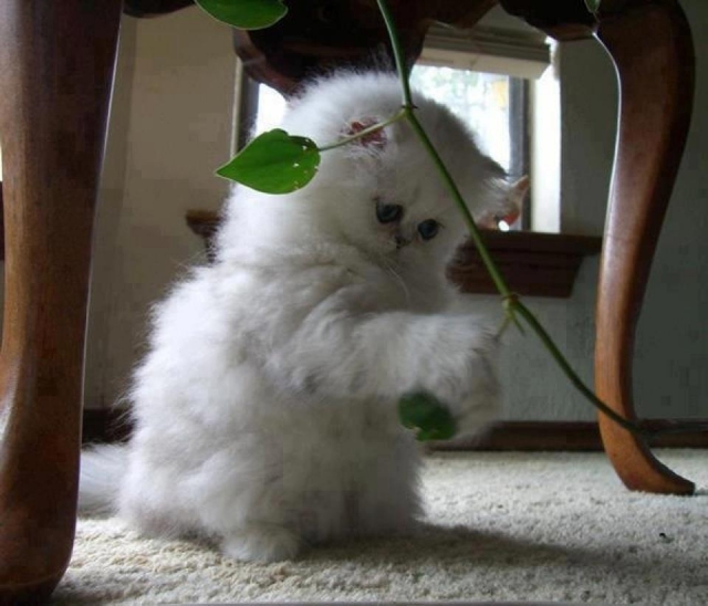 Ik ben een fluweelzachte poes en bovendien erg creatief ... Planten boeien me , vooral als je eraan kan trekken . Zou zo'n groen blaadje ook lekker smaken ? Even proberen !