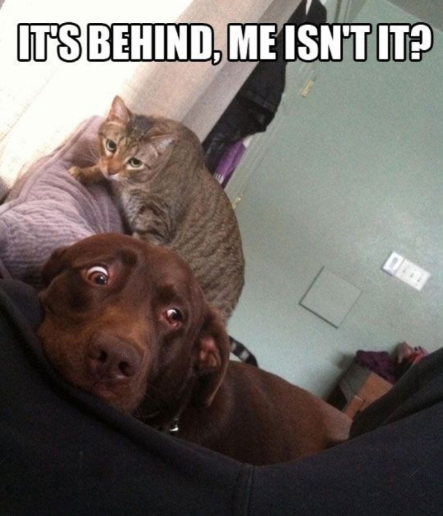 Achter mij duikt Minneke poes op ... Ik ruik het ! Wil ze me weer komen plagen ? Ze vindt mijn oren leuk speelgoed , maar ik ben daarover niet in mijn nopjes . Laat haar maar met de noorderzon verdwijnen !