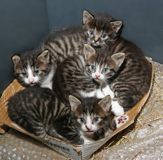 Vier tijgerkatjes met blauwe oogjes in een grote kartonnen doos ... Ze zoeken gezelschap bij elkaar . Hun gestreepte pels toont hun verwantschap . Wat schattig !