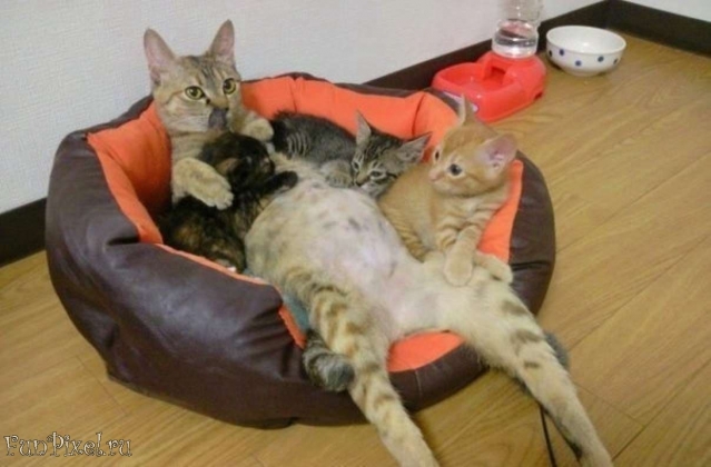 een gelukkige poezen familie, alles is netjes, een diervriendelijk gezin.