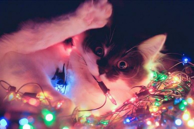 Wat is het fijn om tussen de lichtjes van de kerstboom te liggen ... Al die kleurtjes trekken mij aan . Als er enkele sneuvelen , worden ze wel weer vervangen , he ? Nu is het solden en zijn ze zelfs goedkoper !