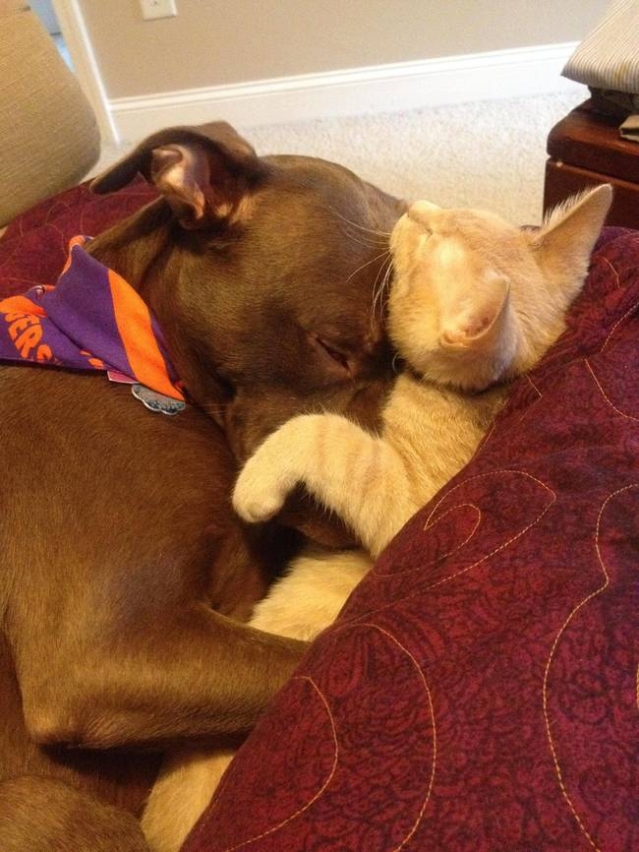 Ik leg mijn kopje op dat van Woef zodat hij met zijn snuit mij heerlijk kan verwarmen . Het is zo zalig dat ik spontaan begin te spinnen ... Zo'n moment is vatbaar voor herhaling !