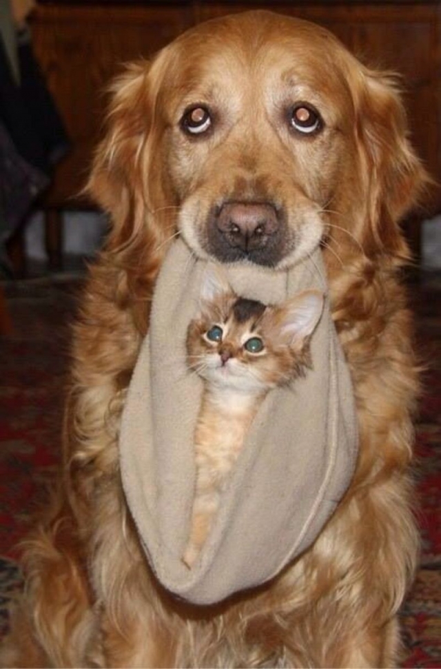 Woef is een goede babysitter : in een fleece-muts sleept hij me overal naartoe ... Ik hou van de kleine uitstapjes en beschouw hem als een echte vriend . Zo blijven we samen !
