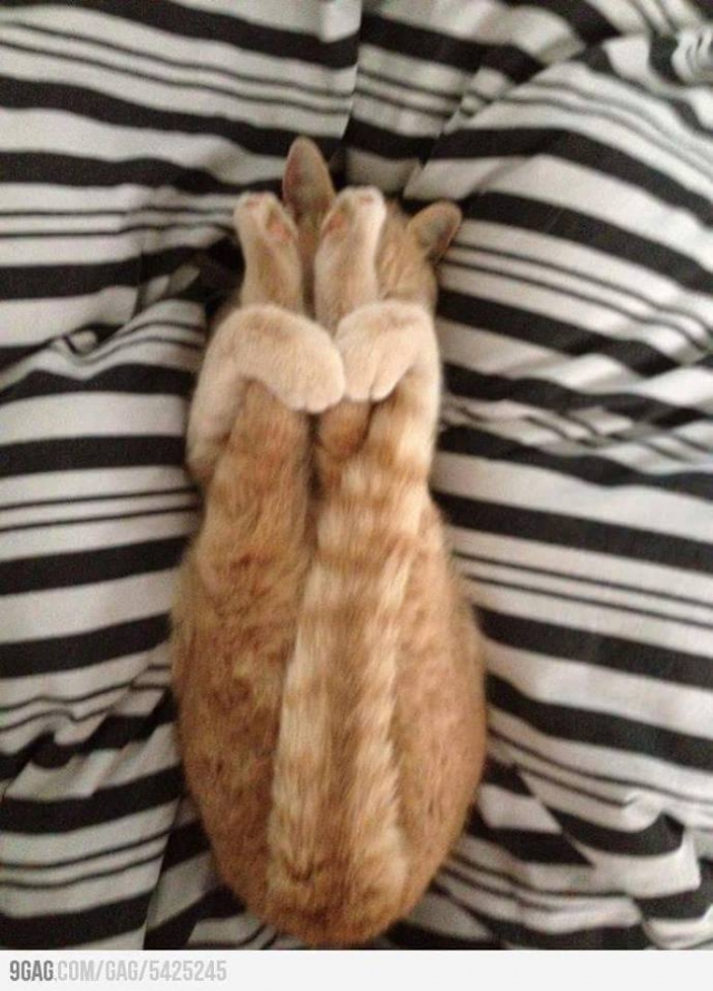 Dit is een yogales voor soepele poezen . Grijp je achterpoten en breng ze naar je kop terwijl je deze met je voorpoten vasthoudt . Ook je staart moet je neus raken . Uitstekende oefening voor een optimale ademhaling !