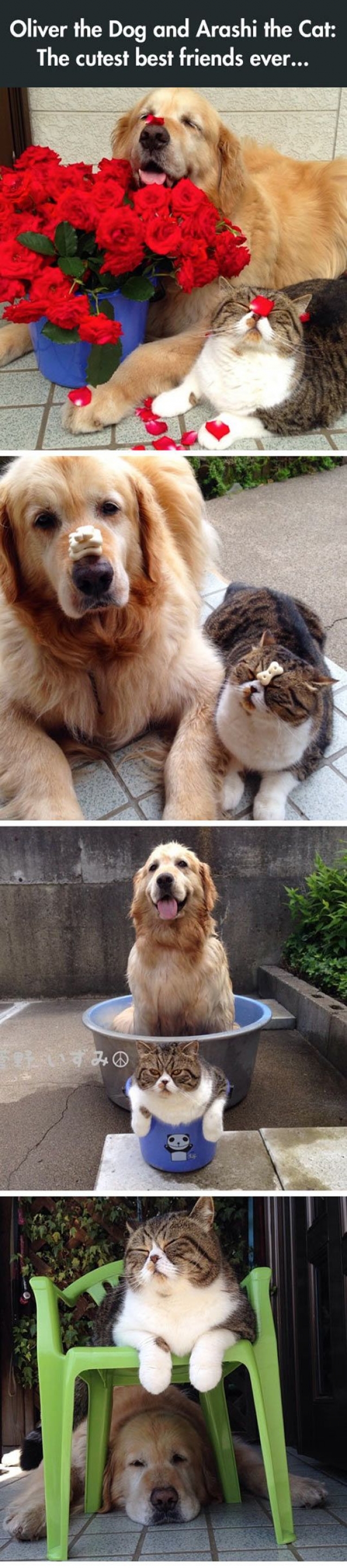 Samen aan bloempjes ruiken , brokjes op je neus stapelen , in een badje zitten en lekker luieren : wij zijn onafscheidelijk ... We hebben eenzelfde belangstelling en onze vriendschap is duurzaam . Het liefste koppel dus !