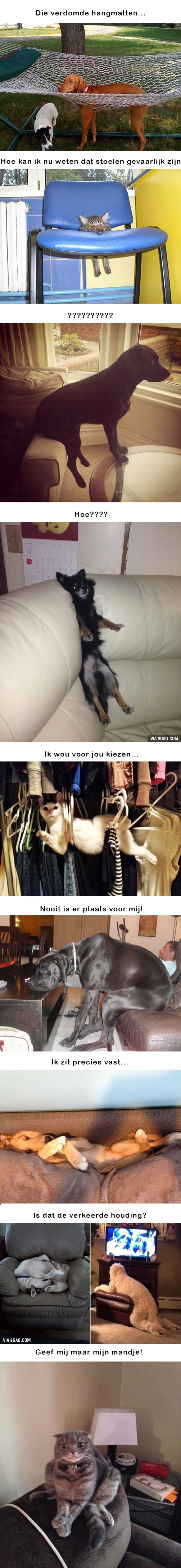 Ongemakkelijke houdingen voor honden en katten ... Toch tref je ze soms zo aan . Waarom ? Willen ze iets nieuws uittesten en valt het dan tegen ? Ervaring leert hen te streven naar meer comfort !