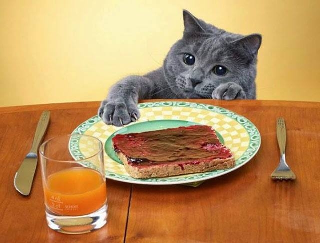 Even kijken wat er op het bord ligt : een boterhammetje met confituur ... Dat valt tegen . Ik zal maar weer onder de tafel duiken en dus ben ik geen pikkendief !
