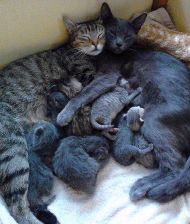 Een kroostrijk gezin dat tracht een rustpauze in te lassen ... Al dat gewriemel van de kittens even loslaten om op adem te komen , is noodzakelijk om te overleven !