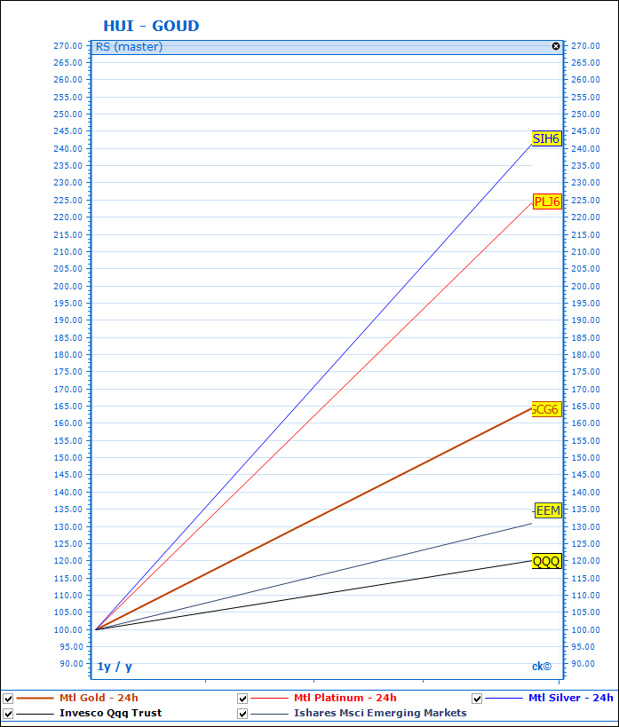 De prestatie van een 5-tal investeringsmogelijkheden over het voorbije jaar. Van boven naar onder: zilver - platina - goud - emerging markets - de Nasdaq.