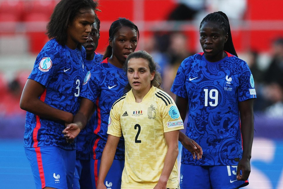 Vandaag in de krant, deze foto van een voetbal(?)wedstrijd tussen Frankrijk en België, al wist ik niet direct dat de Fransen blijkbaar geen blanke - mag dat nog wel gezegd worden? - speelsters in hun rangen meer tellen.