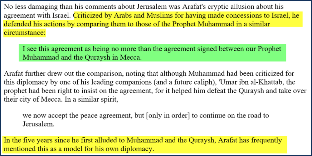 Hij deed heel wat uitspraken over vrede met Israël wanneer hij tot de internationale pers sprak over de Oslo-akkoorden. Maar kort daarna sprak hij in het Arabisch tegen de Palestijnen en moedigde hen aan in het actieve verzet tegen de Israëli’s. Hij vergeleek zijn akkoorden met Israël met de akkoorden die de profeet vroeger heeft gesloten met de joodse stam uit Mekka, de Quraysh.