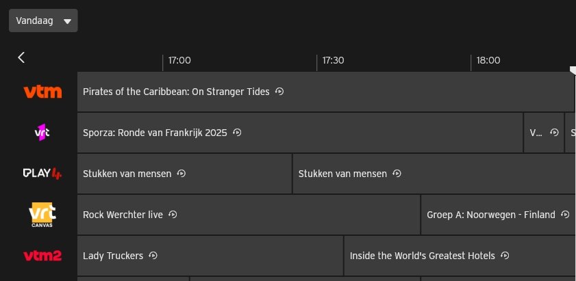 dat zie ik ook op https://www.telenet.tv/en/epg/initial . IK WIL dat op mijn TV zien als ik de "guide" knop op mijn afstandsbediening van mijn TV druk.