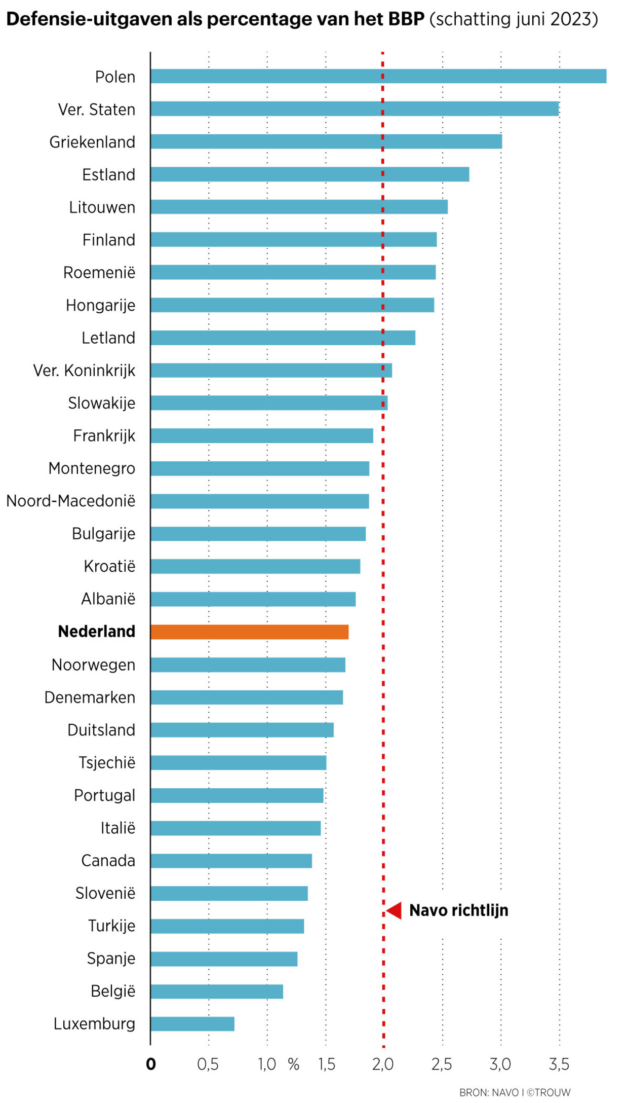 Dat geldt ook voor Estland, Letland, Litouwen. Landen met een veel kleinere economie dan de onze, maar toch spenderen ze méér dan het dubbele aan defensie.