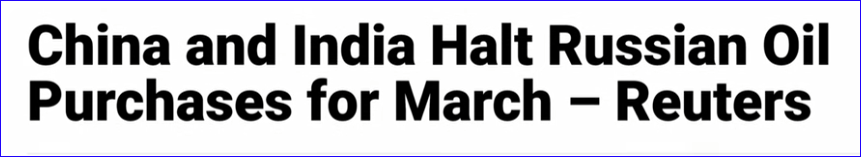 Goed nieuws: China en India hebben voor de maand maart géén oliecontracten afgesloten met RU.