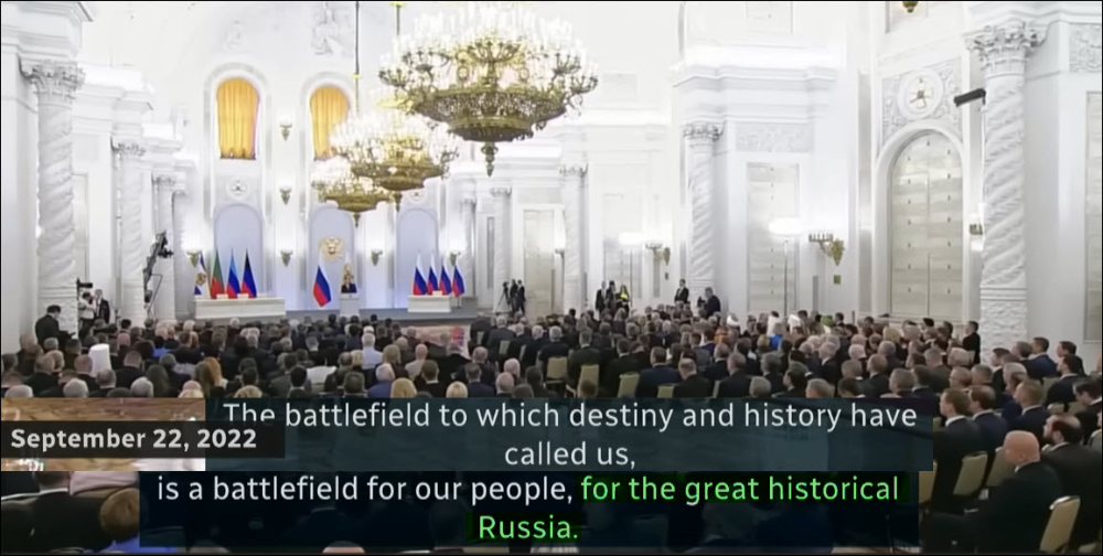 Nergens werd hier beweerd dat Rusland een groot Russisch rijk wil stichten. Het is eerder andersom; Doordat Rusland de uitbreiding van de Navo en de klopjacht op Russen in Oekraine als existentiële bedreiging ziet werd de nadruk gelegd op het belang, behoud en verdediging van de Russische waarden, cultuur en moederland en dat ze bereid zijn om daarvoor te strijden.Voor de rest hoef ik op je meningen niet meer te reageren, want in oktober heb ik dat al uitvoerig gedaan.