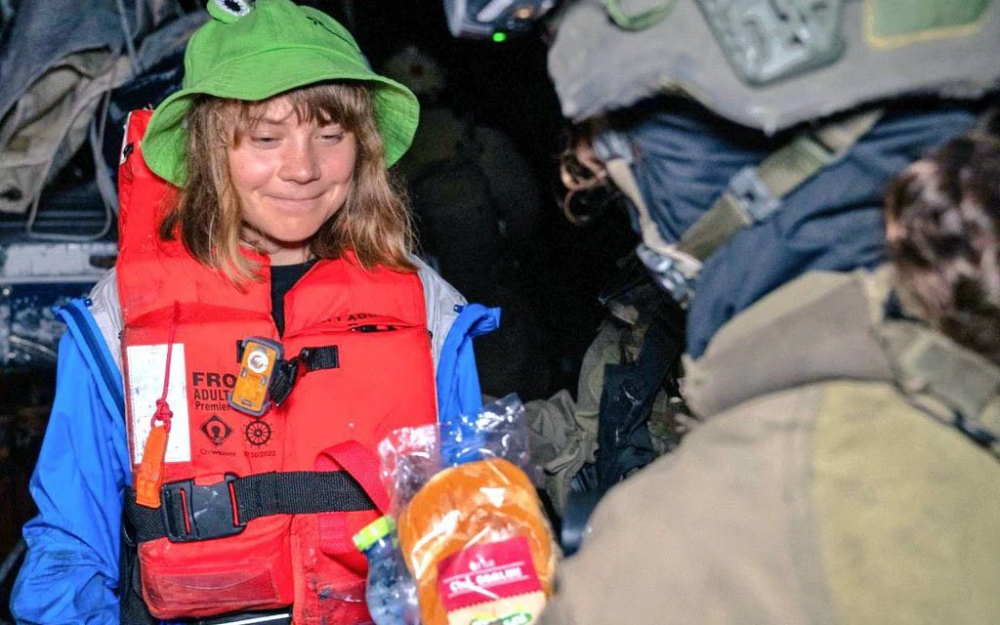Uit dezelfde Telegraph van gisteren als bijschrift bij een foto van dat onnozele wicht als ze een sandwich en een flesje water aangeboden krijgt: "That awkward moment when the Israel Defence Forces spoil your Instagram story."