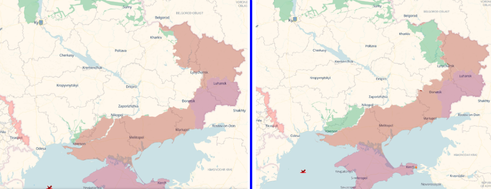 Het linkse groene Cherson oblast gedeelte is terrein ten noorden van de Dnjepr en moeiliijk verdedigbaar. Ik heb hier gisteren of eergisteren al geschreen dat ik dat persoonlijk ook "zou afgeven" . Het bovenste groene gedeelte ligt in de Charkiv oblast , en dat is voor Poetin ook geen doel. Ten oosten ervan ligt Luhansk en daar zijn de Oekraïners niet in kunnen doordringen. Luhansk is de enige oblast die volledig in handen van de Russen is. De terrein winstjes worden nu in de Donetsk oblast gemaakt ( en daar is nog veel te veroveren ). De volledige Zaporizhzhia oblast in handen krijgen lijkt me ook al een onbegonnen zaak voor de Russen , is nochtans ook één van de 4 "geliefde" oblasten.