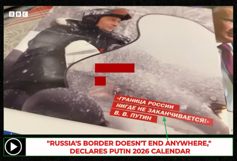 Poetin heeft voor 2026 zijn kalender al klaar. Voor elke maand is er een afbeelding van de sterke leider. Hier op een moto in de sneeuw.