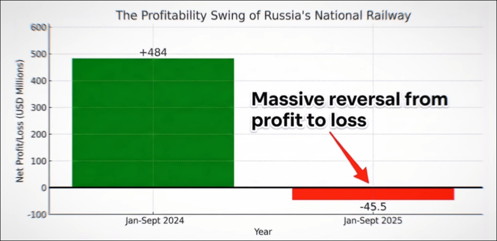 De winst van bijna een half miljard dollar voor de Russische spoorwegen is compleet weg en omgekeerd in een verlies van 45 miljoen dollar. En intussen krijgt UA 90 miljard euro ... 8)