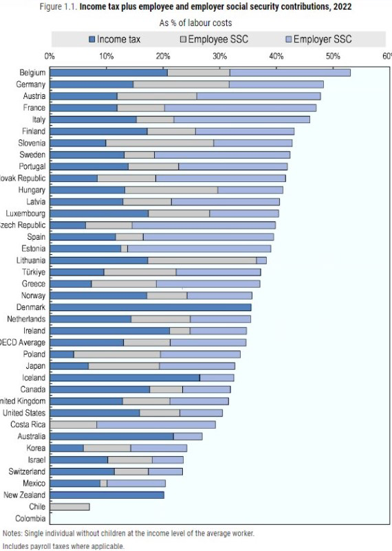 Het overheidsbeslag op arbeid is nergens zo groot als in België. Dat blijkt opnieuw uit een ranking van de OESO, de organisatie voor industrielanden. De belastingdruk in ons land nam het voorbije jaar ook toe, voor het tweede jaar op rij.