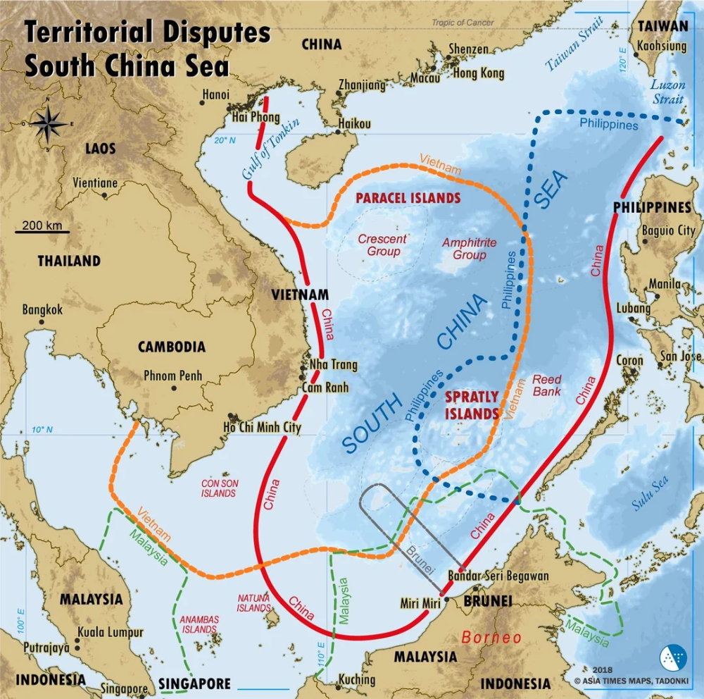 Hiermee provoceert China de buurlanden en meer bepaald de Filipijnen. China claimt 'zomaar' de hele zee tussen China, Vietnam en de Filipijnen. De rode lijn geeft aan wat China opeist. De blauwe stippellijn geeft de territoriale wateren aan van de Filipijnen en de oranje lijn is wat Vietnam claimt.
