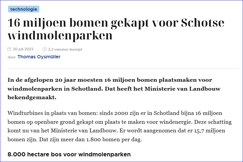 Ik dacht dat bomen een goede opslagplaats voor CO2 waren, maar in Schotland gaan ze anders tewerk. Ze kappen miljoenen bomen om er daarna windmolens op te plaatsen die de CO2 moeten verminderen ... 8O