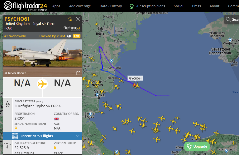 Wat ik zie is dat hij boven de zwarte vliegt begeleidt door 2 Britse Eurofighter Typhoon FGR.4.