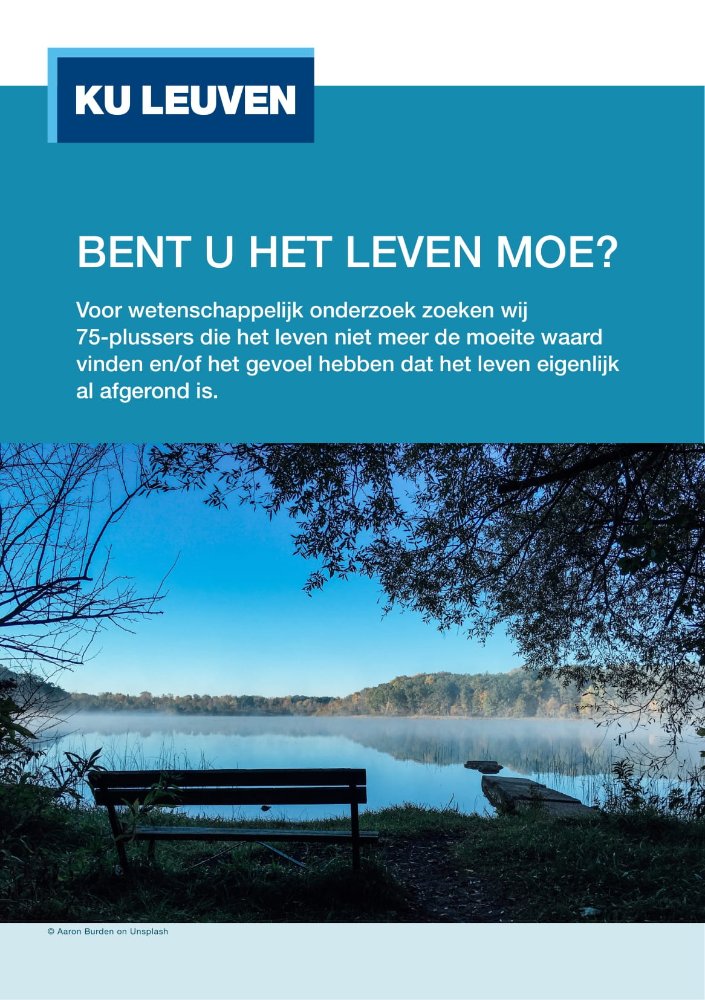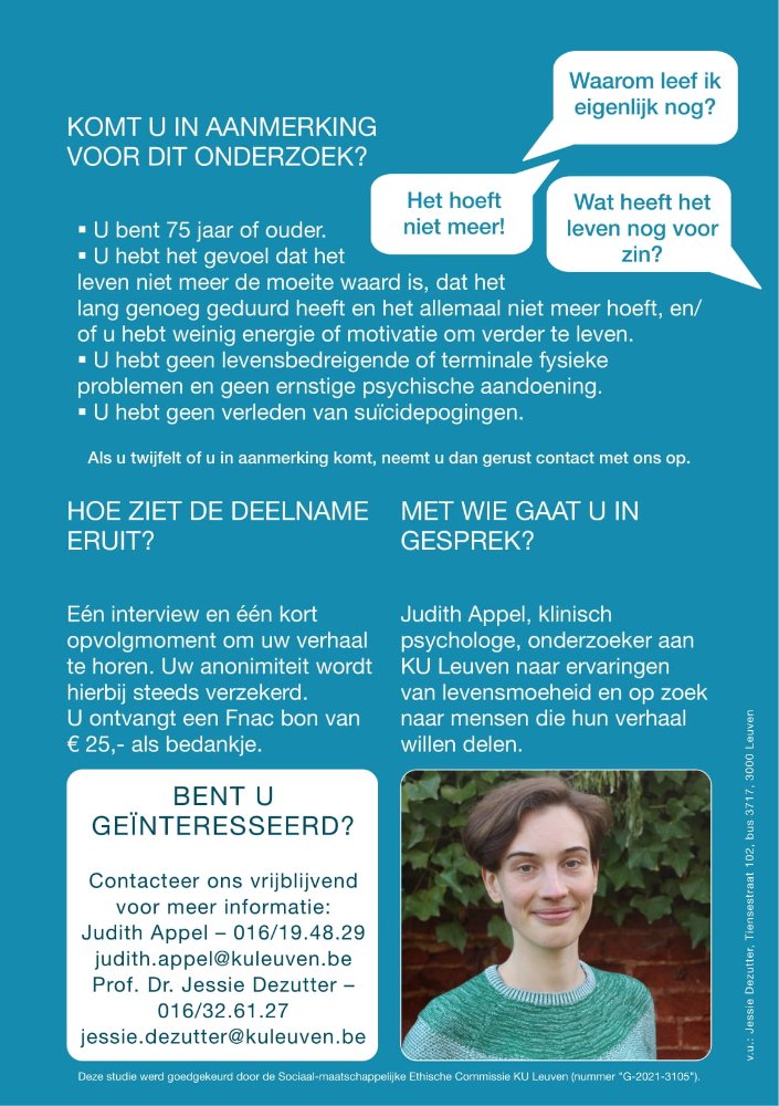 Voor een interview-studie over levensmoeheid zoeken wij 75-plussers die het leven niet meer de moeite waard vinden, het gevoel hebben dat het leven eigenlijk al afgerond is, en/of weinig energie of motivatie hebben om verder te leven. Meer informatie kunt u vinden in de flyer hieronder. Deel dit gerust met kennissen.