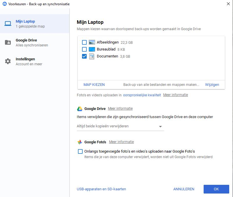 waren alle items aangevinkt. Nu niet meer bij mij. U heeft "Documenten" aangevinkt. Is dit omdat daar je gedeelde gegevens staan? Mijn gegevens staan in Google drive - vroeger daarheen gesleept