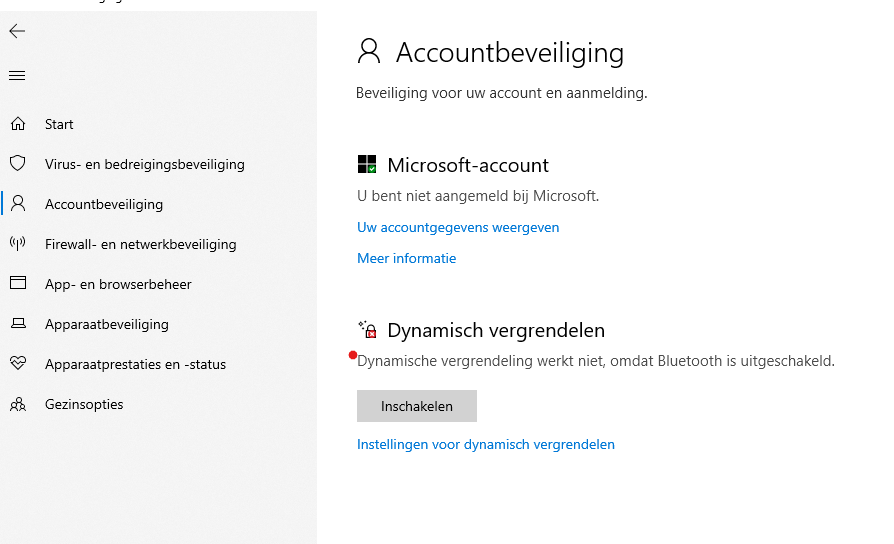 Ineens is mijn Windowsbeveiliging heeft een rode kruis gekregen. De dynamische vergrendeling werkt niet omdat bluetooth uitgeschakeld.