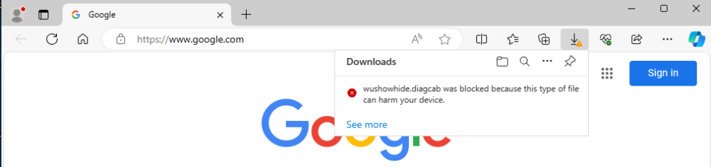 Dat gebeurt ook als ik "Edge" als browser gebruik. Stom dat Microsoft hun eigen software van https://download.microsoft.com/download ... de.diagcab niet vertrouwt,