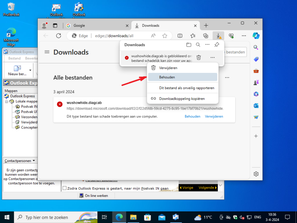 Als ik nu met de muis over dat venstertje beweeg krijg ik drie bolletjes ( ... ) te zien , en als ik dan daarop klik komt de "Keep" ( behouden ) te voorschijn en met een klik erop kan je dat wushowhide1.diagcab in Downloads krijgen.