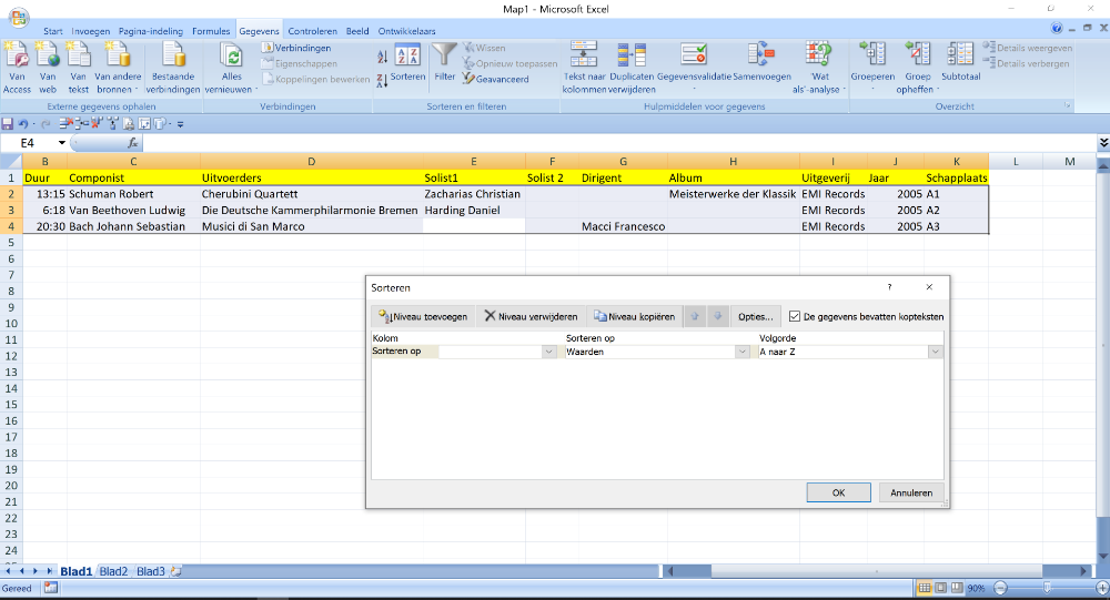Als je een programma zoals excel van Microsoft hebt of een gelijkaardig gratis programma zoals Apache van Open Office en daar een beetje in thuis bent, kan je kan je de gegevens van je CD's zelf in de gewenste categorieën onderbrengen, ze rangschikken per naam van muziekstuk, plaats in uw CD-schap, naam van uitvoerder(s), lengte, jaar uitbrengen van de CD, album, enz...