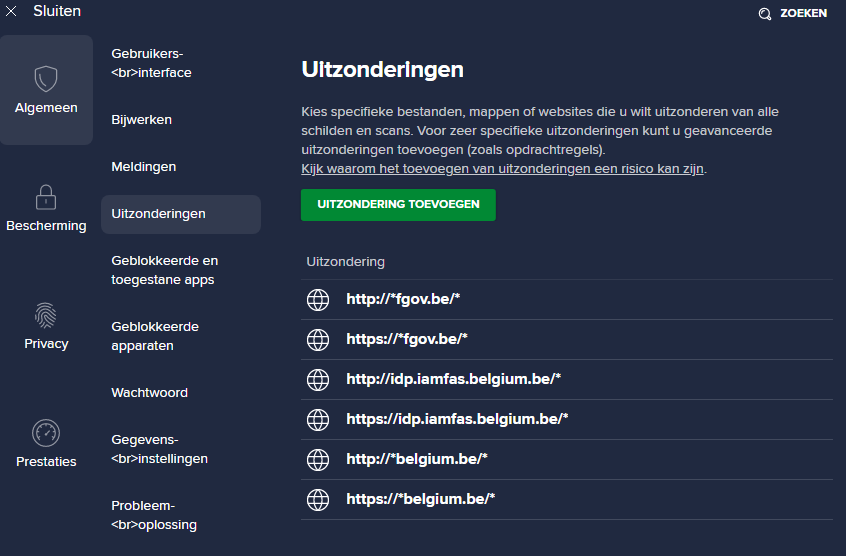 Ook heb ik als uitzondering *fgov.be en *belgium.be toegevoegd, ook zonder succes.