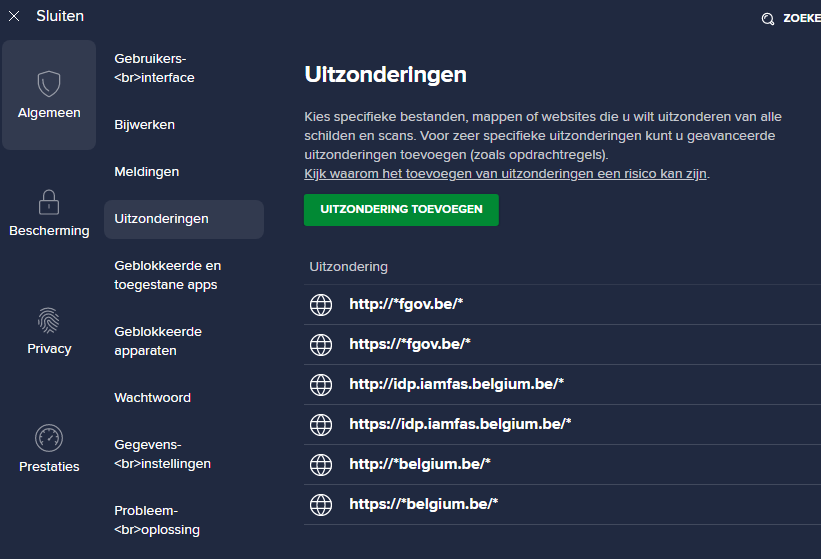 Ook heb ik als uitzondering *fgov.be en *belgium.be toegevoegd, ook zonder succes.