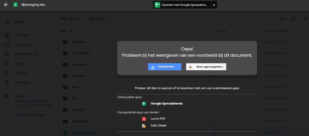 In google drive - mappen openen met klik maar bestanden niet openen bv in excel
