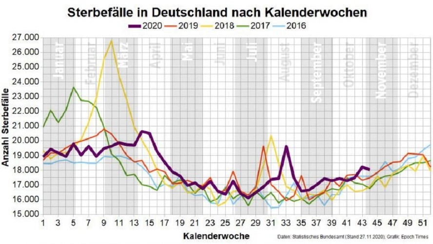 Volgens het Federaal Bureau voor de Statistiek is er geen oversterfte. Tot en met 31 oktober 2020 vielen er niet meer doden dan in de twee voorgaande jaren, schrijft Epoch Times.