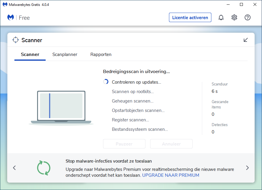 - Klik op "Scannen" en je pc wordt gelijk gescand op mogelijke infecties.
