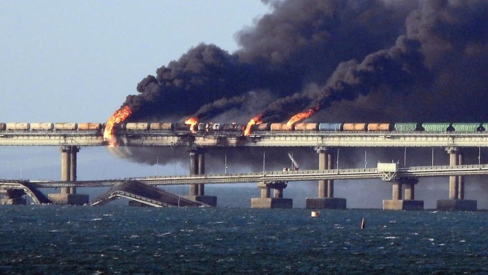 De Russen zouden een bijna nagelnieuwe brug - een prestigieuze en peperdure verwezelijking van het Poetin regime zelf gaan vernielen waarna al die Russen op de Krim als ratten in de val zitten? Ik denk dat het om fake news gaat :D