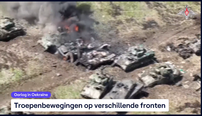 Prentje geschoten uit het VRT Nieuws van19h vandaag https://www.vrt.be/vrtnu/a-z/vrt-nws-jo ... -20230610/ met een filmke vanuit een Russische drone over vernietigde Oekraïnse tanks waaronder een Leopard.