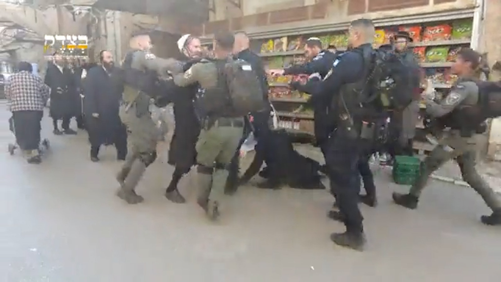 In de Israëlische hoofdstad Jeruzalem is de politie hard opgetreden tegen een tiental antizionistische Joden. Het zionisme is een ideologie waarin de oorspronkelijke staat Israël, zoals in de Bijbel beschreven, hersteld moet worden. De politie was in de wijk Palestijnse vlaggen aan het weghalen, toen er protest uitbrak. Een van de politieagenten duwt een man op de grond, waarna hij ook een andere man nog hardhandig aanpakt.