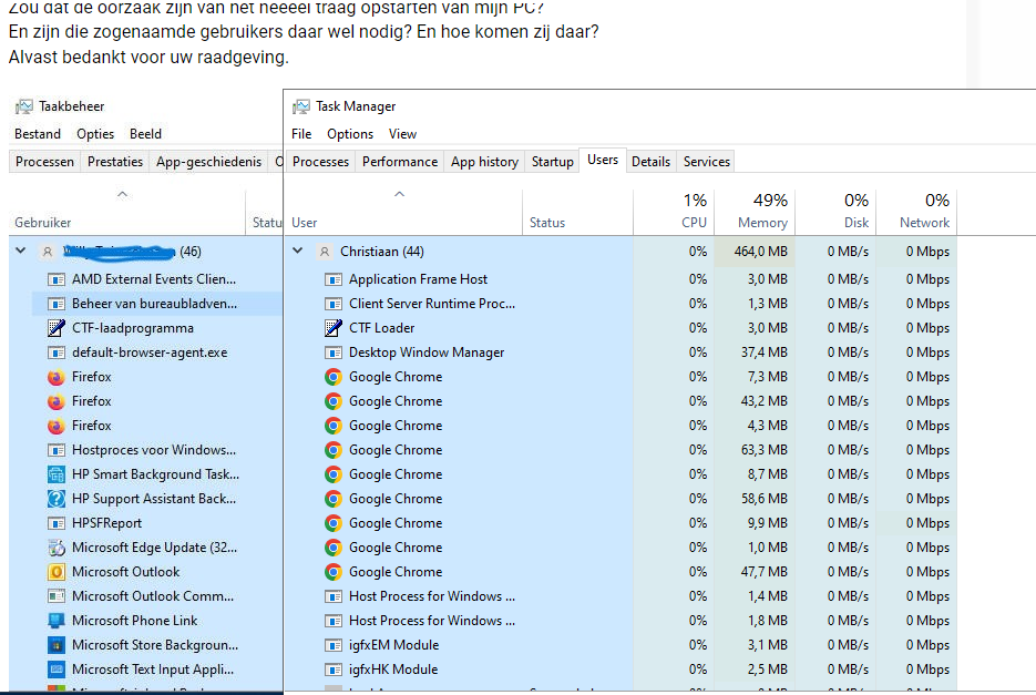 Je moet naar beneden scrollen in kijken welk programma de grootste schijfactiveit en de grootste processor tijd activiteit heeft , dat zijn meestal de boosdoeners. Al die programmas die je ziet , dat zijn je gebuikers ( tel ze maar ).En verder ... hoe meer programmas er tezelfdertijd gestart worden hoe trager je PC zal lopen .... Die 10 % processor tijd is wat veel als je alleen maar met een browser aan het surfen bent.