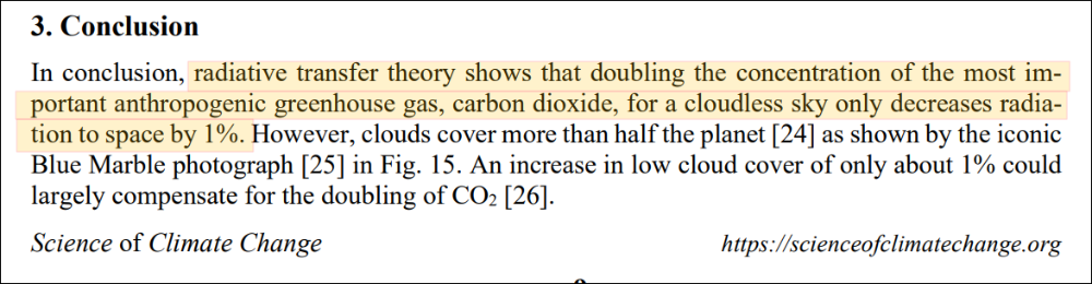 Een toename van CO2 met 100% (400 → 800 ppm) "vermindert de straling naar de ruimte slechts met ongeveer 1%".