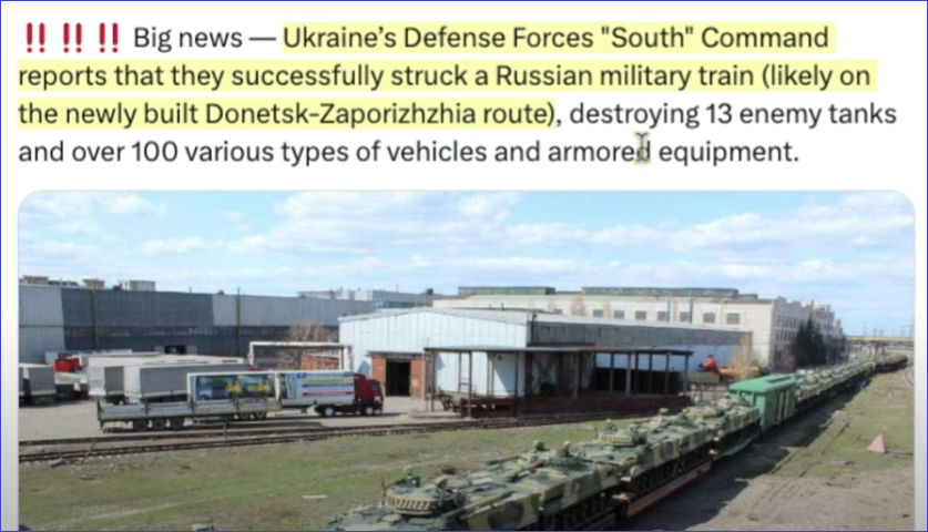 De Oekraïners zijn ongelooflijk creatief in het bedenken van nieuwe aanvalstechnieken. Dit is wat er gebeurd is: een Russische trein die tanks naar UA bracht, trok ook een aantal wagons met graan. Op een bepaald ogenblik is het deksel van die graanwagons eraf gegaan en zijn drones de lucht in gegaan.