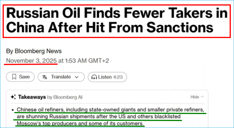 De eerste 9 maanden van '25 werd er 21% minder olie naar China verscheept volgens de RU gazet ...