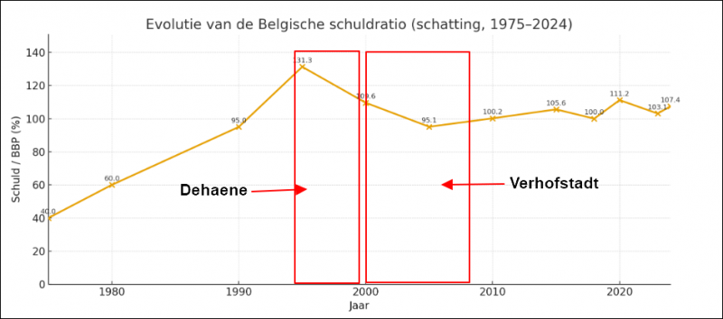 Wat betreft Verhofstadt: de hoofdbrok van de schuldverlaging kwam door duurzame macro-economische elementen: jaren met primaire overschotten en goede economische groei.